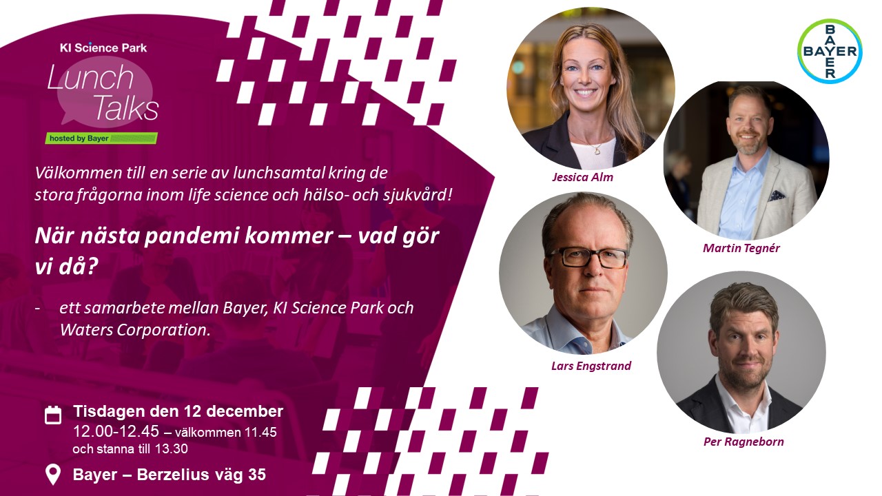 Välkommen till en serie av lunchsamtal kring de stora frågorna inom life science och hälso- och sjukvård! KI Science Park Lunch Talks är ett samarbete mellan Bayer, KI Science Park och Waters Corporation.
