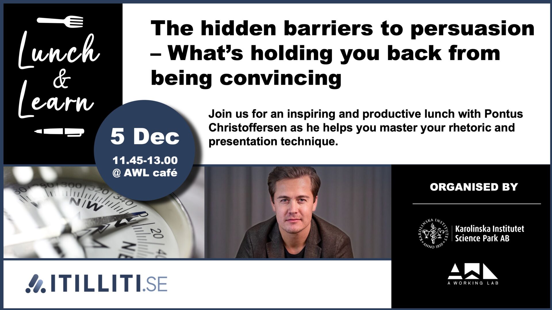 Join us for an inspiring and productive lunch with Pontus Christoffersen as he helps you master your rhetoric and presentation technique.