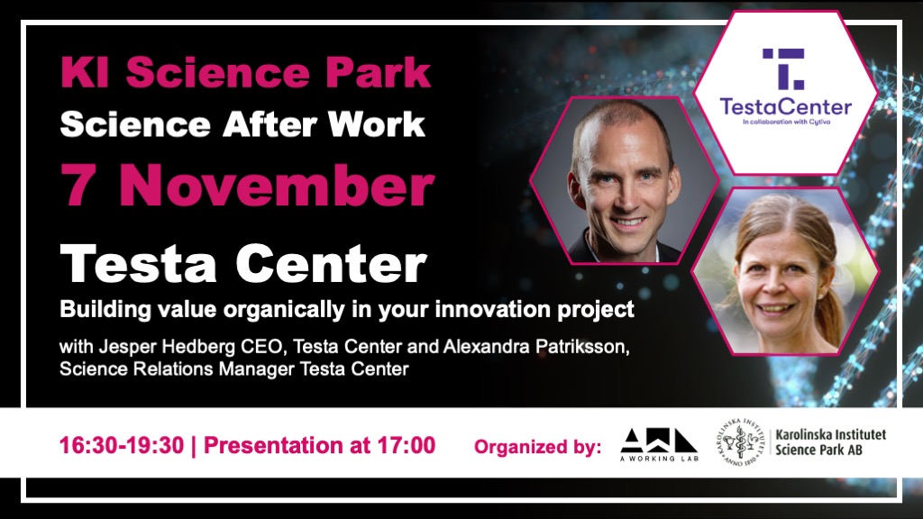 Meet Jesper Hedberg CEO of Testa Center and Alexandra Patriksson, Science Relations Manager from Testa Center at KI Science Park Science After Work