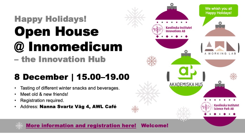 KI Science Park, KI Innovations, Akademiska hus and A Working Lab are welcoming all members and tenants to this open house with winter mingel! Join us and taste different winter snacks and beverages. Meet old and new friends and expand your network.